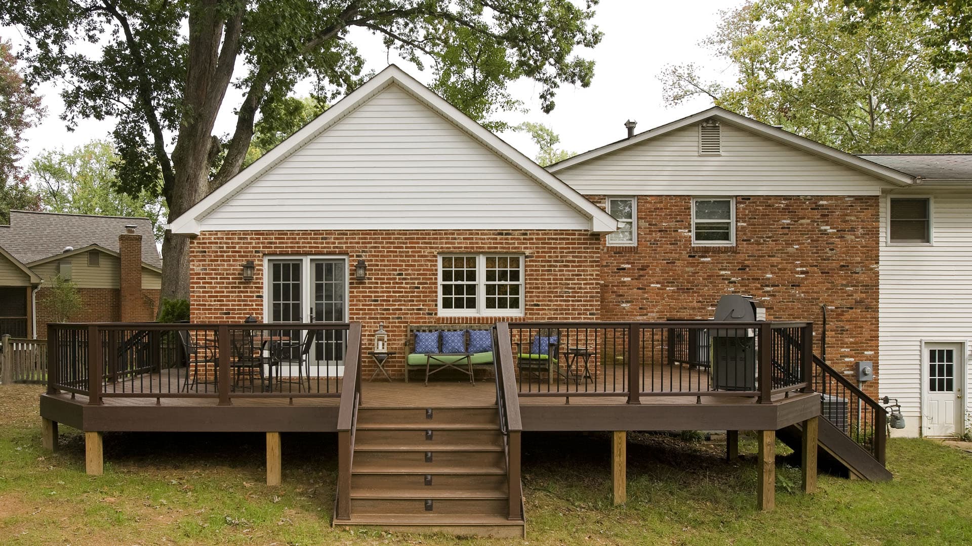 The new addition will now have brick fashcia to match with house large window in kitchen area and two French doors leading into new deck. The cathedral ceiling has added more space and light into this addition. We have made a large opening to the west wall of old dinning room to add a triple large windows in order to gain maximum amount of daylight. Now, their old kitchen has been taken out partition between old kitchen and dinning room has also been taken out and the entire space has become a very large kitchen and open floor plan. We have installed hard wood floors thought out new addition to create a seamless addition into the rest of the first floor.